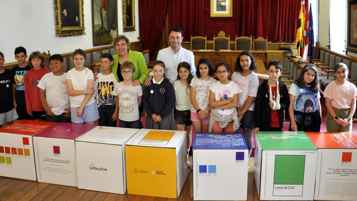 Finalmente, ayer martes, presentaron las conclusiones de todo un año de trabajo y estudio de su entorno en el salón de plenos del Ayuntamiento de Portugalete ante el alcalde jarrillero, Mikel Torres, y la vicealcaldesa, MaríaJosé Blanco. Las conclusiones presentadas por Harlauzoriak giraron en torno a media docena de ejes. El primero de ellos fue la diversión, algo más importante si cabe para quienes están en plena infancia. En este campo, realizaron una apuesta por la diversión para todos y todas los jarrilleros. El segundo de los ejes, por su parte, fue la ayuda, “ayudar a otros y cuidar del pueblo nos pone contentos, alegres y nos hace sentir orgullosos, sabes que estás haciendo el bien. Mejora su salud y alarga la vida de las personas, porque dando ayuda podemos hacer que los demás aprendan a corregir las cosas que hacían mal. Pensar que hay alguien ayudándote también te hace sentir bien y protegido”, declararon. Asimismo, el tercer eje de sus propuestas fue el aprendizaje continuo, mientras que el cuarto, como no podía ser de otra manera, fue la libertad. El quinto eje escogido por los representantes de la infancia que conforman Harlauzoriak fue el cuidado de la naturaleza y su puesta en valor como medio y política de vida. Por último, el sexto eje desarrollado por los escolares ha sido las relaciones entre personas, un punto en el que ponen en relieve la importancia de las relaciones sociales para enriquecer tanto al individuo como a la propia sociedad. Estas propuestas se recogieron en distintos cubos de colores en los que los pequeños pudieron ir depositando sus ideas.