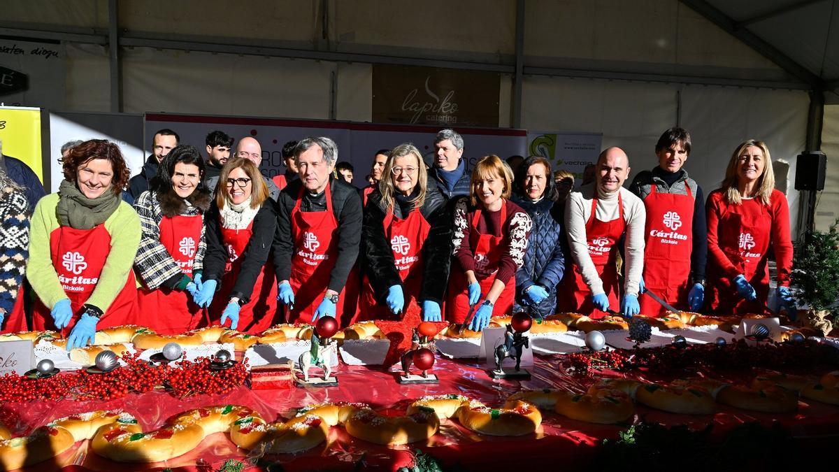En una de las bocanas de acceso a la carpa Aquilino Gómez, guardián de la entrada, se soplaba las manos tratando de calentárselas y al fino de las 11.15 de la mañana la voz metálica del altavoz iba cantando, con voz de niño de San Ildefonso, el número de las primeras papeletas premiadas en el primero de los tres sorteos anunciados. Era el preámbulo del corte oficial del roscón, en el que ocuparon la primera línea de fuego la presidenta de la Asociación de Comerciantes del Casco Viejo, Susana Alaguero; la teniente de alcalde de Bilbao, Amaia Arregi; la consejera de Bienestar, Juventud y Reto Demográfico del Gobierno Vasco, Nerea Melgosa; la propia Elena Unzueta; el obispo de Bilbao, Joseba Segura; Teresa Laespada; la diputada foral de Acción Social, Amaia Antxustegi; Nekane Narbaiza, de Lapiko Catering; Álvaro Parro, de Laboral Kutxa; el piloto Joseba Iraola y la presidenta de Bilbao Basket, Isabel Iturbe.