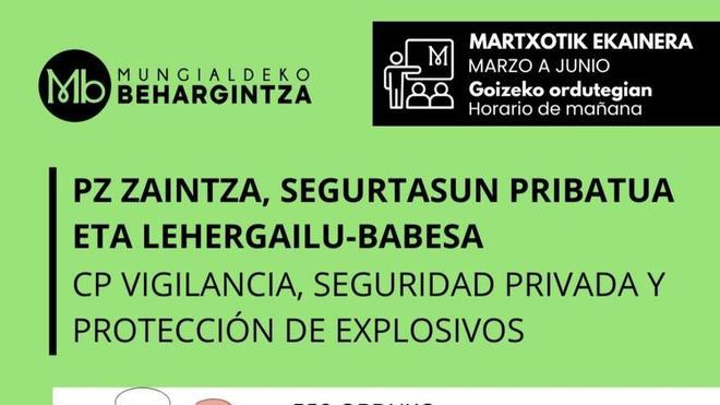 El área de Empleo del Ayuntamiento de Mungia, Mungialdeko Behargintza, ha puesto en marcha un curso certificado de 350 horas en vigilancia, seguridad privada y protección de explosivos, reconocido por Lanbide, que capacita a los participantes para obtener la habilitación como vigilante de seguridad y vigilante de explosivos.