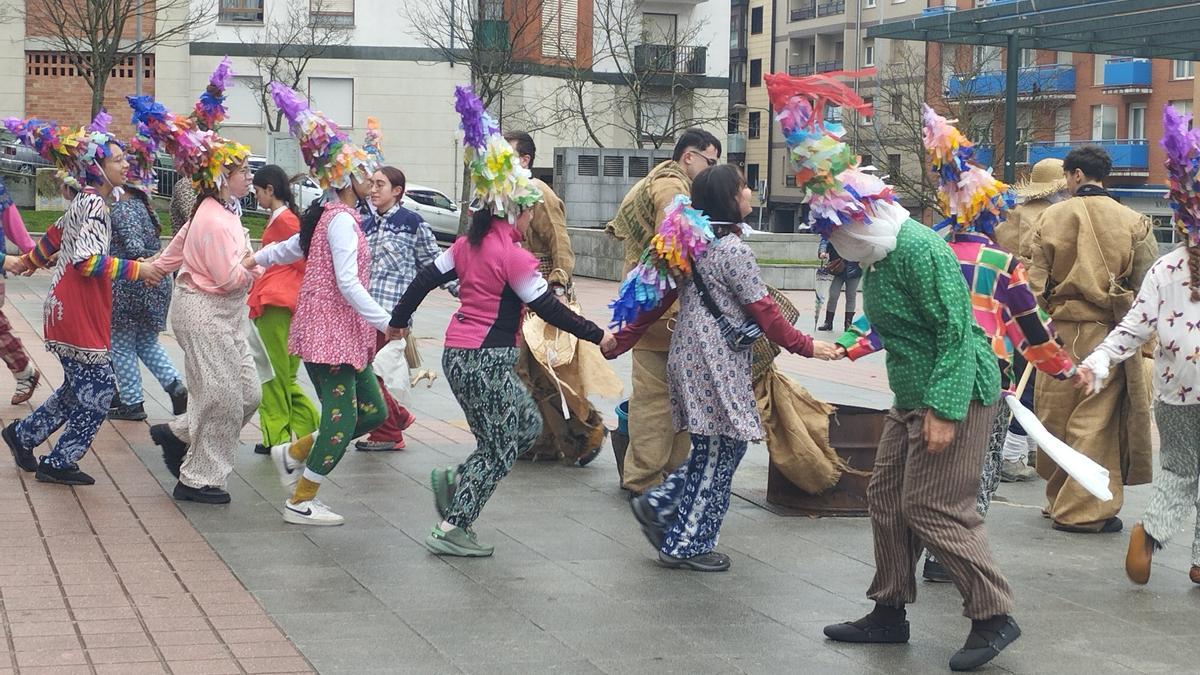 “Este es el pistoletazo de salida para el aniversario. Ya hemos tenido dos quedadas, una como toma de contacto, y la otra, como primer ensayo”, apuntó ayer Borja Zubillaga, integrante de esta asociación de Astrabudua. Y es que ya se van dando los pasos iniciales hacia el que será el principal evento de conmemoración del medio siglo de vida. “El plato fuerte será el 13 de junio en el campo de fútbol: haremos un pequeño festival con todos los grupos que han pasado por Trabudu, de chicos y chicas, y será un fin de semana lleno de actos. Pero a lo largo del año tendremos más”, matizó Borja. Y el momento propicio para comenzar con la programación especial se posaba sobre estas fechas, emulando a los personajes carnavaleros de Lantz, y a días de que Trabudu escenifique su querido Dantzxori –será el viernes a partir de las 19.30 horas–. “El primer carnaval que se trajo a Astrabudua y a Erandio fue el de Lantz. Gente de nuestro grupo se fue en coche hasta allí y con una cámara de VHS fue grabando cómo era, algo que no gustó nada en Lantz”, rememoró Borja. “Luego, para nosotros, Altsasu ha sido mucha inspiración y también Lapurdi, hasta que pudimos hacer nuestro Carnaval”, añadió este miembro de Trabudu, desde la plaza Mendiguren, el hogar del colectivo, y donde terminó la jornada festiva de ayer con una sesión de dantza plazan y chorizada popular. Antes, unas 180 personas de Trabudu impregnaron Astrabudua con esa leyenda que cuenta cómo el pueblo intenta atrapar al malvado Miel-Otxin y a su compinche Zaldiko, mitad hombre mitad caballo. Tienen a todos amenazados y además han atacado al enorme y querido Ziripot, un hombre que no puede ganarse la vida de ninguna manera pero que regala cuentos e historias a los habitantes de Lantz.