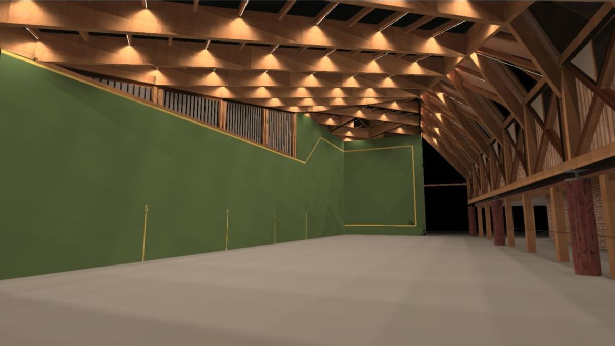 El diseño incorpora una gran cercha inspirada en tipologías tradicionales vascas, que se apoya parcialmente en el muro preexistente del frontón, previamente analizado para garantizar su capacidad resistente. En los laterales abiertos se instalarán cerramientos ligeros con panel sándwich y carpinterías triangulares de madera de pino barnizada, reforzando la imagen contemporánea del conjunto. Más allá de la cubierta, el proyecto resuelve la transición entre el frontón, la casa de comidas y la vía pública mediante un sistema de pavimentos continuos de hormigón fratasado con piedra procedente de las canteras de Ereño y piezas de mármol integradas en masa. Se incorporará un banco lineal que ordena el borde y facilita la relación con las pendientes existentes.