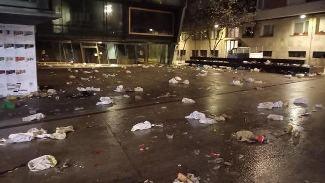 Las fotografías muestran cómo, tras horas de fiesta y gran afluencia de público, varias zonas amanecieron con abundantes bolsas, botellas de cristal y plástico y vasos esparcidos por el suelo. En contraste, las imágenes posteriores reflejan los mismos espacios completamente limpios gracias a la intervención de los servicios municipales.