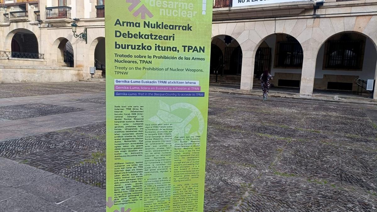 La instalación incorpora además un elemento relevante en la trayectoria institucional de la villa. El propio panel recuerda que Gernika-Lumo fue el primer municipio de Euskadi en adherirse al tratado, un paso que refuerza su posicionamiento en favor del desarme y conecta con una línea de actuación sostenida en el tiempo. En este sentido, la memoria del bombardeo de 1937 funciona como un punto de referencia desde el que proyectar ese compromiso en el contexto actual.