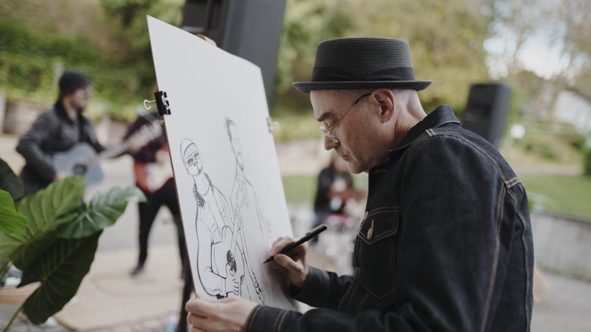 Le seguirá, de 13.00 a 15.00 horas, un concierto dibujado gratuito, que invitará a pasar un buen rato con una copa de txakoli y la música en directo de la banda Folk Terra Nai mientras CharLee Mito, que cuenta entre sus hazañas artísticas la de haber sido finalista del cartel del Tour de Francia, ilustrará esta chulísima postal en directo.
