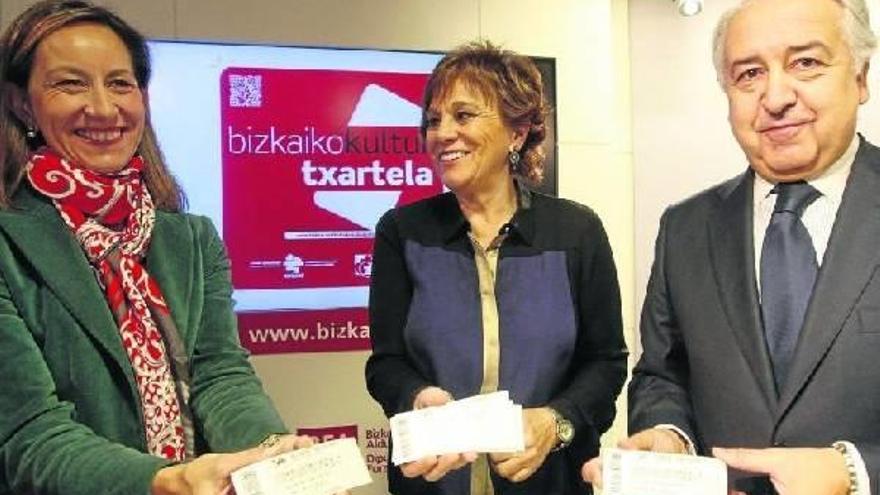 La diputada de Cultura, Josune Ariztondo, el presidente de la Confederación Empresarial de Comercio de Bizkaia (Cecobi), Pedro Campo, y la directora de marketing de BBK, Inés Monguilot, presentaron ayer en rueda de prensa los detalles de esta campaña, para cuya financiación la Diputación ha destinado 500.000 euros en este ejercicio presupuestario. Una campaña que se desarrollará en dos fases: la primera arrancará a partir del lunes y abarcará hasta el 31 de diciembre, y la segunda tendrá lugar en primavera, entre el 17 de marzo y el 18 de mayo. Se sacarán a la venta en total 46.875 txartelas, 23.750 en esta primera fase y el resto, en primavera. Las tarjetas, que se adquirirán en los cajeros de Kutxabank, se podrán usar cuando se realicen compras o se adquieran entradas directamente en los establecimientos que llevarán un distintivo de adhesión a la campaña.