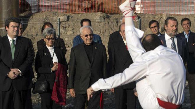 Tras un aurresku de honor, las autoridades colocaron la primera piedra del futuro puente que llevará el nombre del arquitecto. Como testimonio, se depositó a 22 metros de profundidad un cilindro metálico con monedas en curso, un plano de la obra y diversos periódicos. También se descubrió una placa con la inscripción “Frank Gehry Zubia” y se entregó al arquitecto una placa conmemorativa. El nuevo puente, con un presupuesto de 20,9 millones de euros, conectará la futura isla de Zorrotzaurre con la Ribera de Deusto una vez concluida la apertura del canal.