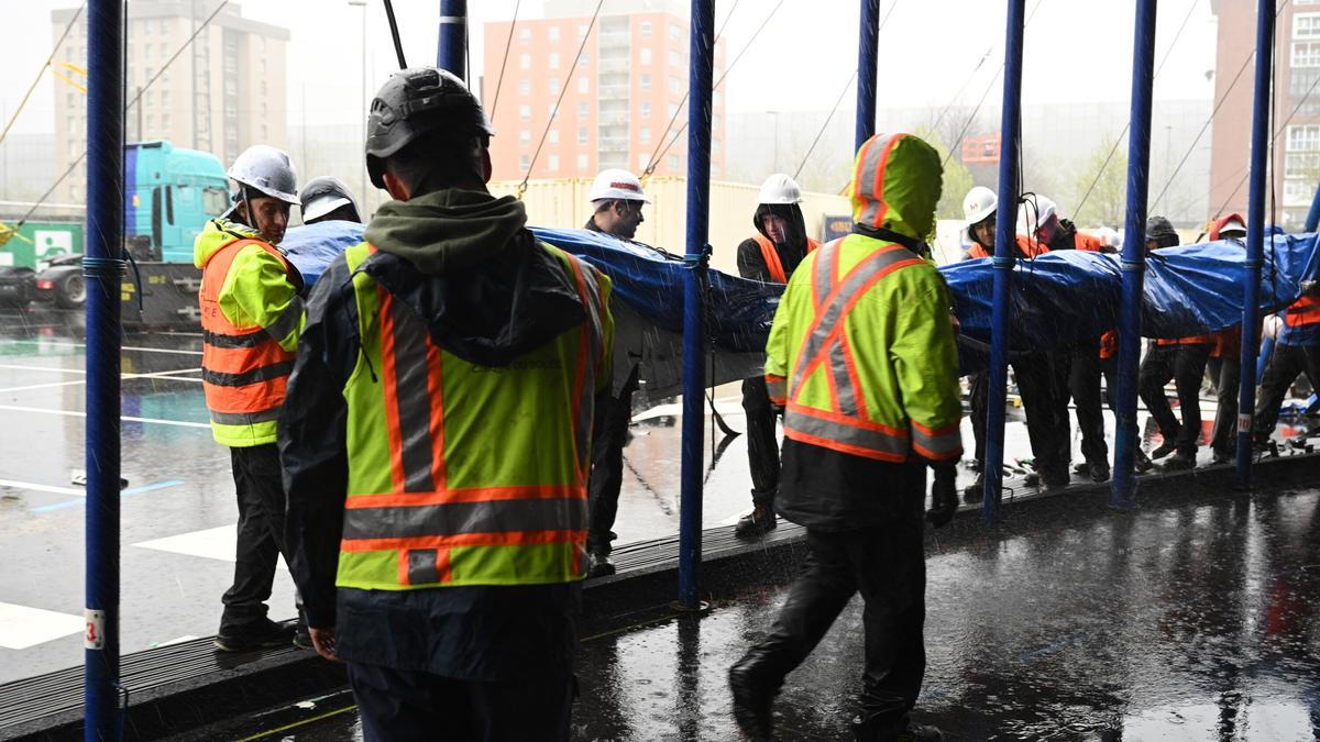 “Estamos preparados. ¡Uno, dos, tres!”, se escuchó al coordinador de esta parte del montaje y, acto seguido, los trabajadores, todos ellos de Bizkaia, empezaron a levantar los pilotes que iban dando altura a esa zona de las instalaciones. Una vez levantados esos puntales, trabajadores del Circo del Sol se afanaban en ajustar todo bien para que la estructura esté firme y segura durante las próximas siete semanas. Además, desde la zona central, otro trabajador se afanaba en desplegar y tensar la lona de la carpa en la zona que ya se había alzado.