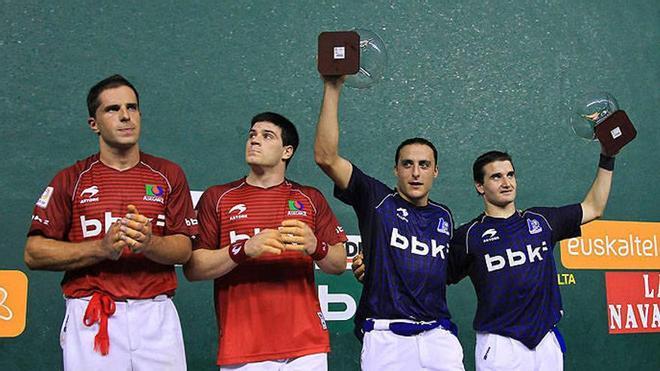 BILBAO. Aimar Olaizola volvió ayera demostrar su mordiente, recuperadapara la causa tras seis mesesapartado de las canchas, en el Adarragade Logroño, en la últimaprueba del verano. Destila colmilloel delantero de Goizueta con susmanos de fuego, a pesar enfrentarsecon el bombardero Juan Martínezde Irujo, sin duda el mejor dela temporada estival, que se havuelto con la resurrección física ydeportiva del de Ibero y Aimar enotro lugar común, muy a pesar dePablo Berasaluze y Aritz Begino, quienes afanados en arrebatarlesel protagonismo, haciendo gala deespíritu indomable, se colocaronbajo el foco, pero acabaron quemadosen dos partidos de infaustomaterial y peor resultado. En esoslugares comunes, en ese tránsitohacia la bipolarización de la mano,dado que Irujo y Olaizola parten deun escalón más alto al del resto,aprovecharon los rescoldos, las brasasdel calor de sus corazones, losdos jóvenes zagueros. Si bien MikelBeroiz posee las cualidades y laconfianza de un grande, aún necesitaalgo de tiempo para calibrarse-sí, es rocoso; sí, cubre mucha canchay, además, es velocísimo; perotodavía necesita canas y patas degallo-; mientras que Miguel Merino,quien amanecía en San Mateode parche, de solución de últimahora, se ha anudado la responsabilidadal cuello y demostró cualidadescomo zaguero de un perfil parecidoal del huartearra: rapidez, solvenciay rocosidad; no pegan porpegar.