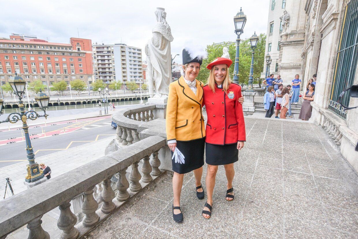 Itziar Lazkano e Iratxe Palacios han vestido, por primera vez, los trajes tradicionales de Pregonera -chaqueta amarilla y bicornio negro- y Txupinera - chaqueta y txapela roja- que lucirán durante toda Aste Nagusia