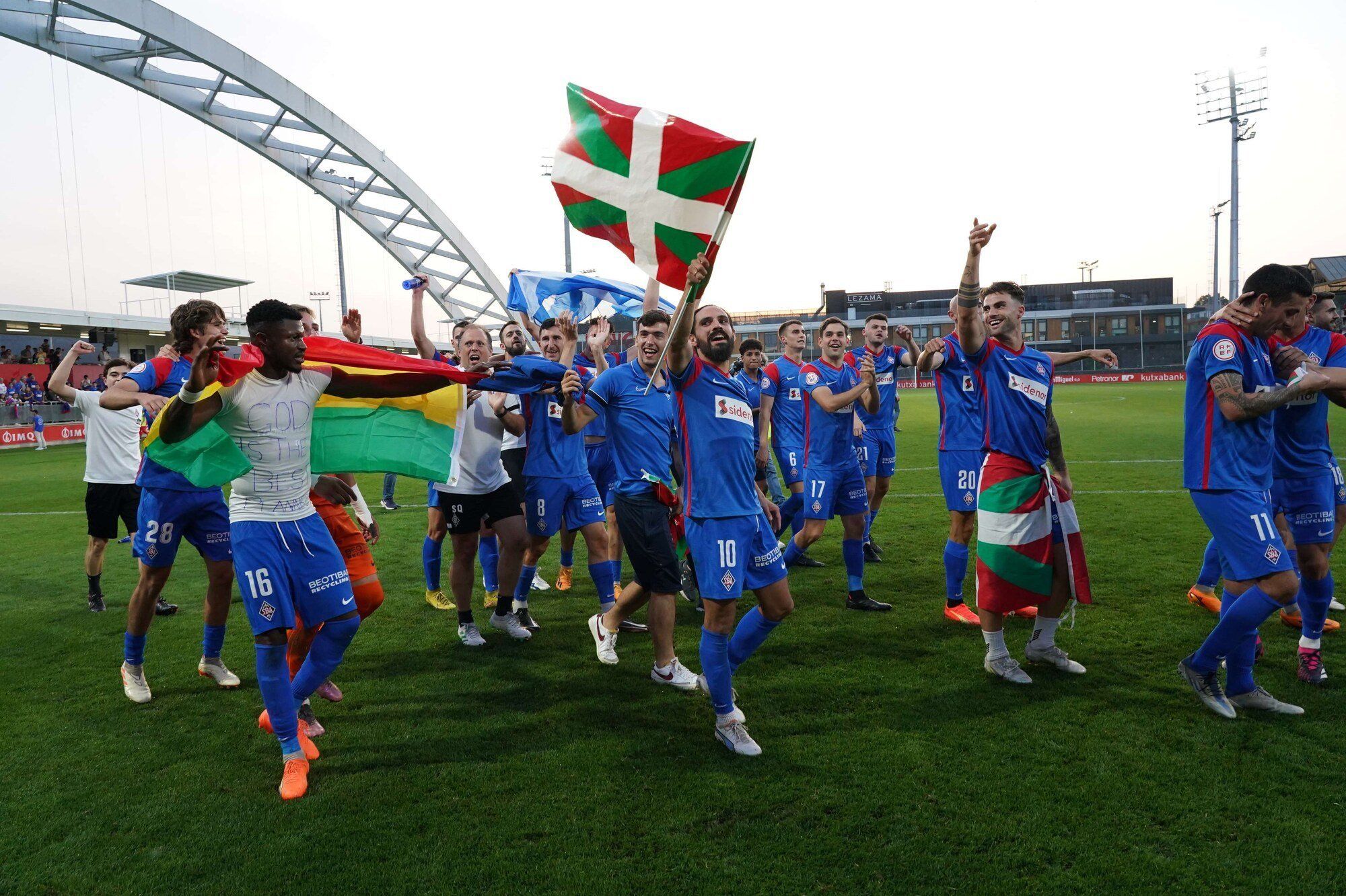 Los jugadores del Amorebieta celebran sobre el césped de Lezama el ascenso a Segunda División
