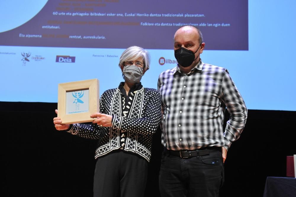 Arantza Castañiza, mujer clave en Etorki Dantza Taldea, con Kepa Ogiza de Bizkaiko Dantzarien Biltzarra.