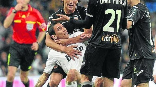 El paso de los minutos y la personalidad del Valencia incrementaban el nerviosismo madridista. Tino Costa soltaba un latigazo de 35 metros que repelió el travesaño. Fortalecido por el centro, el conjunto valencianista empujó a su rival a explotar las bandas. El juego del Real Madrid se redujo a Di María. Tan brillante en unas acciones como locuaz en otras.