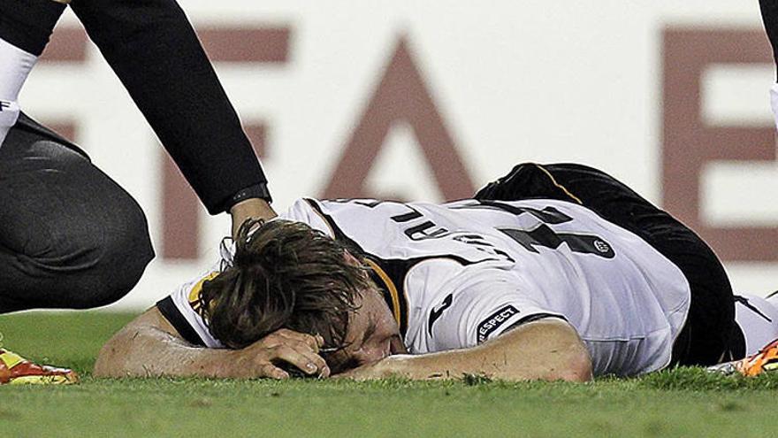 VALENCIA. El jugador se lesionó al principio de la segunda parte del partido de vuelta de la semifinal de la Liga Europa en Mestalla ante el Atlético de Madrid como consecuencia de un traumatismo que, según el doctor Candel, se produjo "él solo por un cambio de dirección de la rodilla, en la que sufrió una torsión traumática que el ligamento no aguantó".