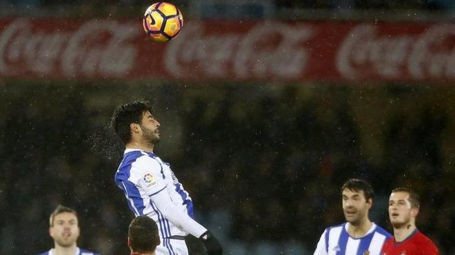 Osasuna se creció ante las adversas condiciones y suyos fueron los acercamientos más peligrosos en la primera mitad, sobre todo el de Kenan Kodro, ex de la Real e hijo de Meho Kodro, que en un mano a mano con Gero Rulli estrelló su remate en las piernas del cancerbero argentino.