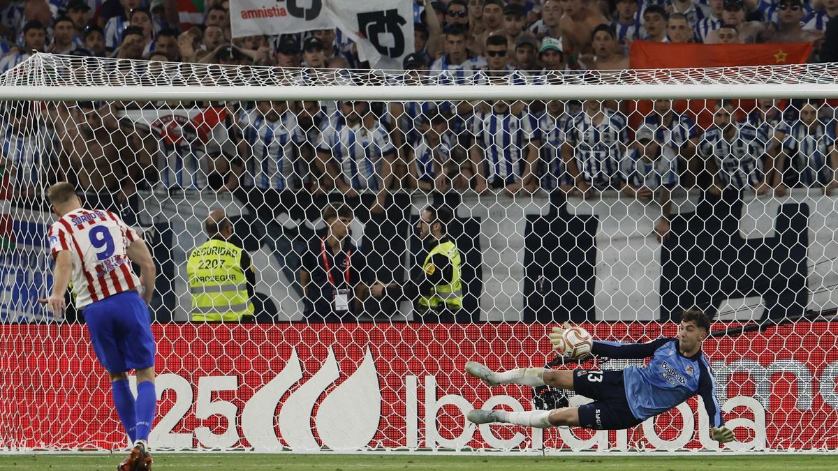 La Real Sociedad se proclamó campeona de la Copa Sevilla y, tras llegar a la prórroga con 2-2 ante el Atlético de Madrid, se llevó la gloria en una tanda de penaltis en la que Unai Marrero, habitual en este torneo y suplente en liga, fue el héroe al detener dos lanzamientos, a Sorloth y a Julián Álvarez, y marcar el último Pablo Marín. La final fue trepidante, con un primer tiempo con más ímpetu de los donostiarras, que se adelantaron dos veces, primero con un tanto de Barrenetxea a los 14 segundos y luego, tras neutralizarlo Lookman en el 18, con otro de Mikel Oyarzabal de penalti, cometido por el meta Musso sobre Guedes. La segunda mitad fue de total dominio Atlético, que forzó la prórroga con un gol de Julián Álvarez en el 83, aunque se llegó a los penaltis y en ese trance fue más efectiva la Real.