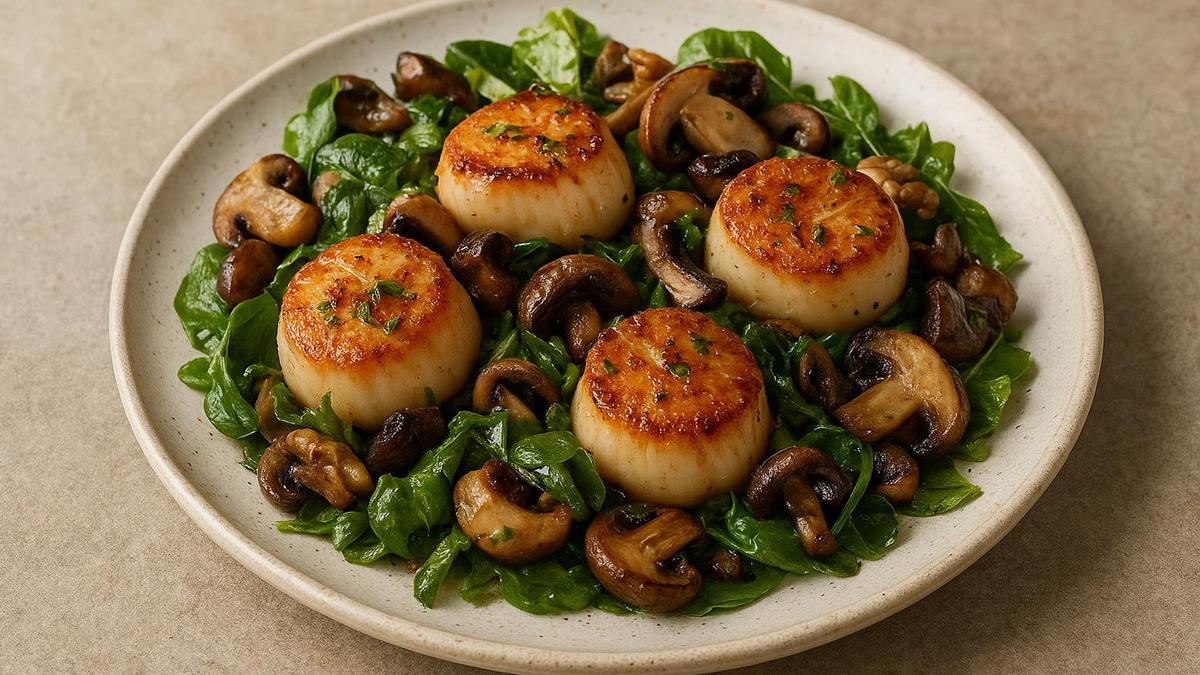 Una propuesta ligera y sofisticada para equilibrar las celebraciones. Las vieiras frescas, salteadas con hongos de temporada, se sirven sobre una base de hojas verdes y vinagreta suave. Una receta que combina mar y tierra, frescura y elegancia, ideal para sorprender con un entrante diferente.