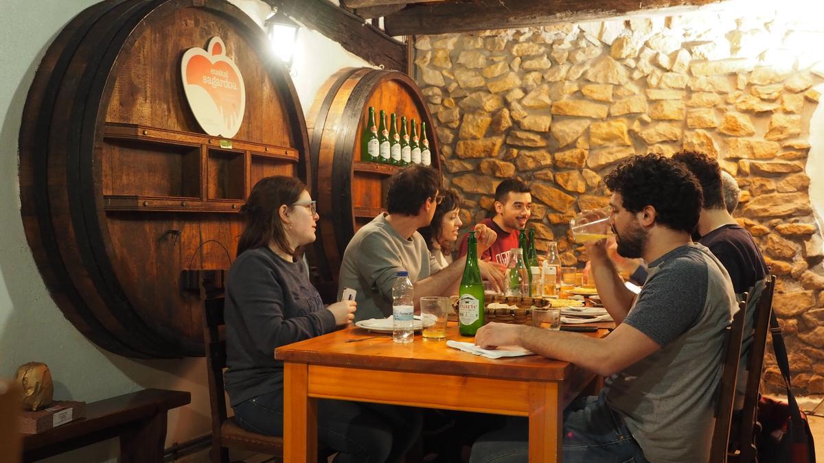 En su comedor de alma rústica, para 75 comensales, que abre de viernes a domingo al mediodía durante todo el año, sirven un menú tradicional de sidrería que empieza con un caldo. Sigue con tortilla de bacalao, zancarrón y taquitos de bacalao con pimientos, y como plato principal, pollo de caserío a la sidra o chuleta a la brasa. Para culminar, postres caseros y café. Y todo regado con sidra de las kupelas o/y en botella. De hecho, durante la comida, la bodega está abierta para hacer txotx y probar diferentes sidras.