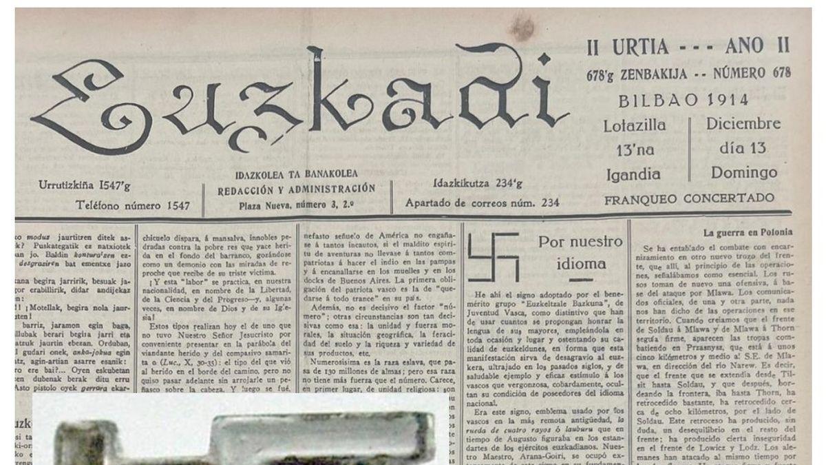 Estas viñetas resultan especialmente llamativas por incluir en varias de ellas la cruz gamada. Conviene recordar que, a comienzos del siglo XX, esta cruz era un símbolo vasco muy anterior a que Hitler lo adoptara como emblema de su partido. De hecho, fue utilizado por asociaciones como Euzkeltzale Bazkuna (Asociación de la Lengua Vasca), de Juventud Vasca de Bilbao, a partir del 13 de diciembre de 1914, a través de las llamadas Euzkel-Orratzak. Estos distintivos, que se colocaban en corbatas y solapas, servían para que los euskaldunes de la época pudieran reconocerse entre sí y saber con quién podían hablar en euskera. Su función era, en esencia, la misma que cumplen hoy las chapas de Euskaraldia. A partir de 1935, para evitar confusiones con la simbología nazi, la cruz gamada fue siendo sustituida por el lauburu, aunque a comienzos de la guerra civil algunos gudaris, en especial de ANV, siguieron llevando alfileres con la gamada en el uniforme, llamando la atención a los milicianos que provenían de fuera de Euzkadi por lo que significaba para ellos dicho símbolo.