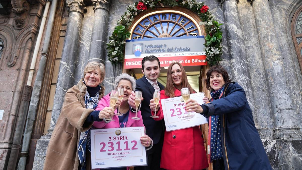 Parte del primer quinto premio de la Lotería de Navidad ha caído en Bilbao con el número 23112, repartiendo 60.000 euros al décimo. La suerte ha sonreído a la administración de Azcarreta, ubicada en El Arenal nº1. Cristina y Asun, junto al resto de compañeros del punto de venta, se han mostrado muy contentas por despachar dos series completas, lo que supone un total de 120.000 euros.