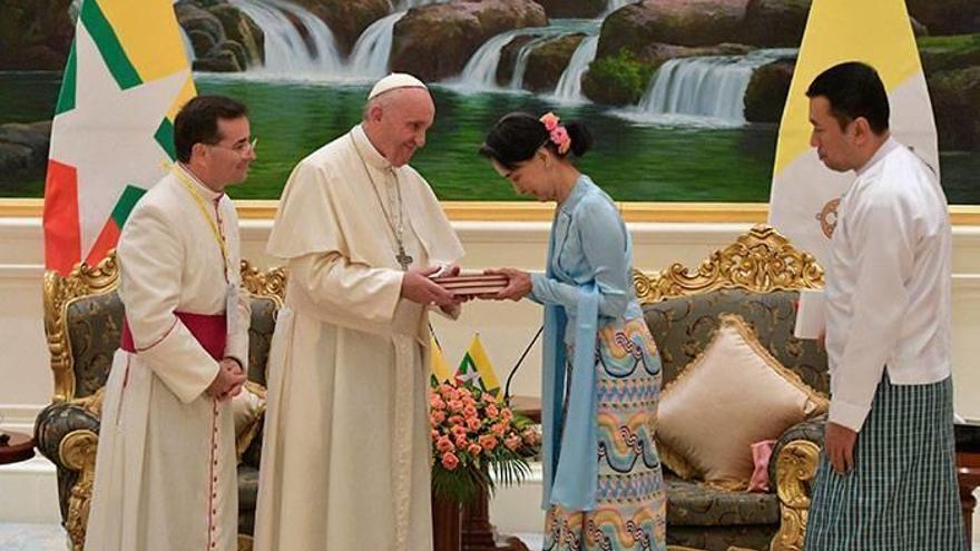El pontífice se reunió privadamente y por separado con ambos, unos 15 minutos con el presidente y unos 20 con la jefa de facto del Gobierno, con el telón de fondo de la crisis de los rohinyás musulmanes, a los que Birmania no considera ciudadanos de su país y que ante la última terrible ofensiva del Ejército en el estado de Rakain han huido masivamente hacia Bangladesh.
