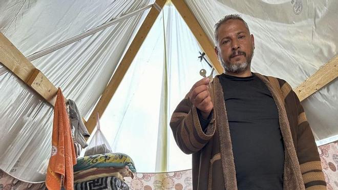 Ali Ahmad Mohamad Asfur sale de su tienda, sobre la que se apoya una placa solar, con un pequeño bolso blanco deshilachado del que saca dos llaves: con las que abría la puerta de su casa y la de su hijo; ambas localizadas en un edificio de dos plantas de Jan Yunis, sur del enclave palestino. “Huimos por el miedo a la guerra, a los bombardeos y la destrucción que comenzó desde el primer día y continúa hasta hoy”, explica Asfur, de 50 años, quien abandonó su hogar el mismo día que comenzó la guerra.