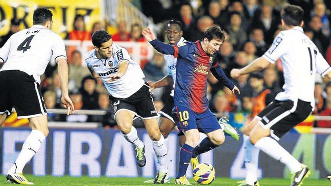 La abulia exhibida por el equipo blanco, Ronaldo al margen, ha dejado al Barça el camino hacia el título de Liga tan expedito que sus jugadores pelearon en Valencia, pero sin exprimirse, dada su amplia distancia clasificatoria sobre el Atlético y Real Madrid, y concedieron un empate que dice mucho de Ernesto Valverde, un técnico que ha sabido reactivar al equipo levantino. Hizo bien Valverde en no castigar deportivamente a Ever Banega, que llegó tarde y al parecer beodo al entrenamiento del viernes, más que nada porque el controvertido muchacho argentino batió a Valdés. Además, el plan diseñado por el exentrenador del Athletic sirvió para desactivar a Messi, aunque la Pulga finalmente anotó de penalti el tanto del empate azulgrana, ampliando así a doce el récord de jornadas consecutivas que lleva agujereando la meta rival.