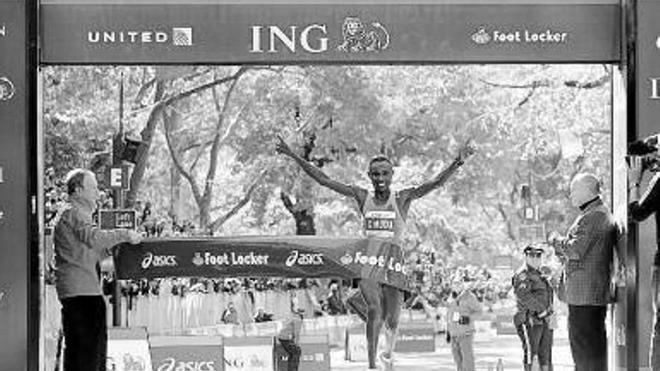 Nueva York. El keniano Geofrey Mutai, autor de la mejor marca de la historia en el recorrido descendente de Boston (2h03:02), consiguió ayer la victoria en el maratón de Nueva York con un nuevo récord de la carrera (2h05:06), seguido de su compatriota Emmanuel Mutai, que entró minuto y medio después. En categoría femenina la etíope Firehiwot Dado, tres veces ganadora en Roma, batió en los dos últimos kilómetros, con una marca de 2h23:15, a la favorita, la keniana Mary Keitany. Foto: efe