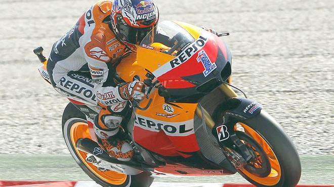 En MotoGP, Stoner se ha impuesto en el duelo con su compañero de equipo Dani Pedrosa. El australiano ha marcado 1:42.775, mientras que Pedrosa ha cerrado la sesión con 1:42.875. Tercero en la primera toma de contacto ha sido el mallorquín Jorge Lorenzo, líder del Mundial, con 1:43.008.