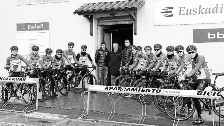 Entrenamiento en derio. Después de la foto de familia, los quince valores de la Fundación Euskadi llevaron a cabo ayer por la mañana un entrenamiento de equipo con el que arrancaron la nueva temporada. Bajo la dirección de Gorka Gerrikagoitia y Jorge Azanza, el grupo recorrió las carreteras del Txorierri y Mungialdea para completar un test de unos 100 kilómetros. En el entrenamiento estuvieron las cuatro caras nuevas de la escuadra presidida por Miguel Madariaga: Dorian Aramendi, Diego López, Jon Gil y Gaizka Sotil. Foto: Juan Lazkano