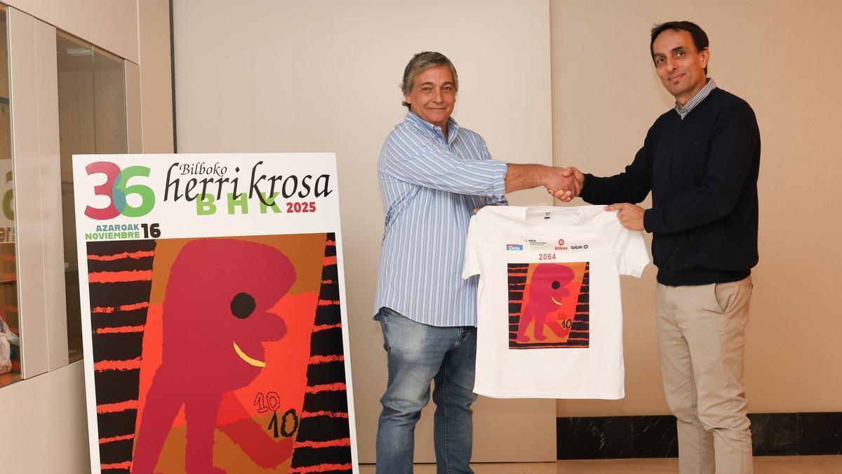 Aitor Oria, de la organización de Bilboko Herri Krosa, e Ibon Mujika, director gerente de Editorial Iparraguirre, escenificaron un año más el apoyo que ofrecerá DEIA, como uno de los patrocinadores oficiales, a la carrera popular con mayor arraigo de todas las que se celebran en la capital vizcaina.