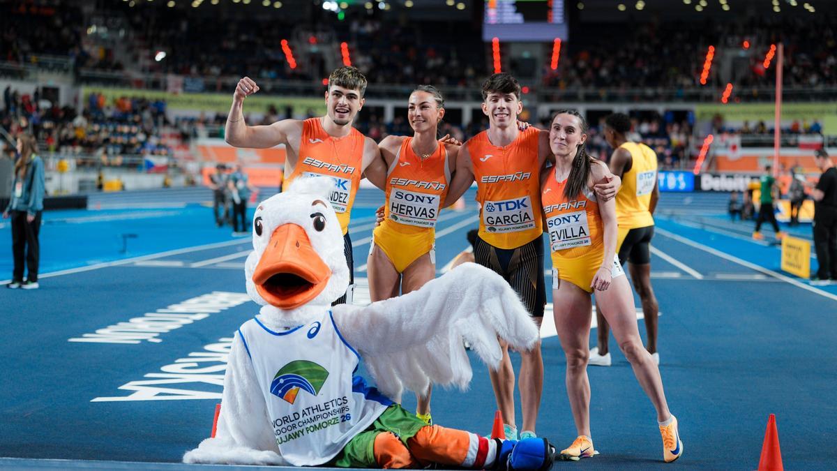 Markel Fernández (Sopela, 2003) no olvidará el Mundial de pista cubierta de Torun. El vizcaino, después de caer el viernes en las semifinales de los 400 metros lisos, donde no encontró la fluidez necesaria, este sábado ha hecho historia junto a Paula Sevilla, David García y Blanca Hervás en el relevo mixto de 4x400, que se estrenaba bajo techo en la cita mundialista. El combinado estatal ha logrado la medalla de plata tras parar el crono en 3:16,96, su mejor registro de la temporada y récord de España. Solo se ha visto superado por una intratable Bélgica, oro con 3:15,60. El bronce ha sido inicialmente para Jamaica con 3:17,13, pero minutos después ha sido descalificada por cambio irregular en el polémico primer paso del testigo, por lo que ha cerrado el podio Polonia (3:17,44), la selección anfitriona.