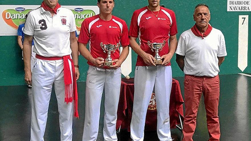 torneo de san fermín de pala. El Torneo de San Fermín de pala profesional se resolvió ayer por la mañana en el frontón Labrit de Iruñea, con triunfo en la final de Necol e Imanol (en la imagen escoltados por Óscar Insausti y José María Porrón) en su duelo contra la pareja compuesta por Gaubeka y Brefel (10-8, 10-7, 9-10, 9-10 y 10-8). El tercer puesto se lo adjudicaron Landeta, sustituto de Fusto, e Ibargarai.