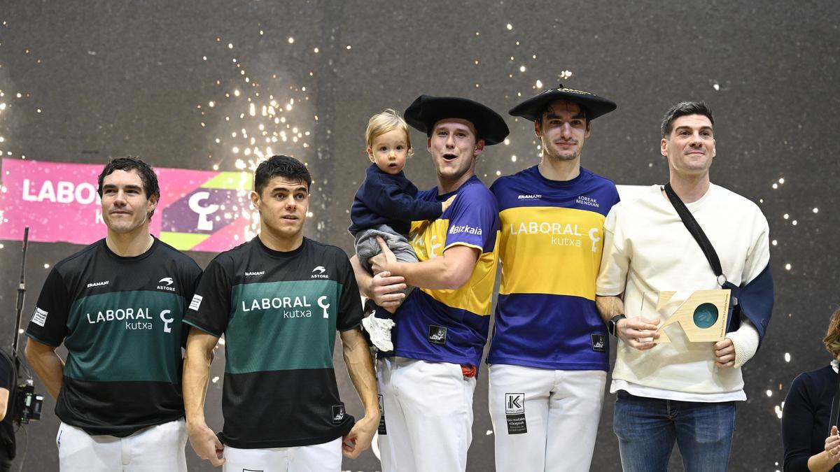 Thibault Basque alza la mano y con un gesto llama a Xabier Barandika para que acuda con él a lo más alto del podio del Eusko Label Winter Series de cesta punta profesional –puntuable dentro de la Jai Alai League–. Johan Sorozabal le pasa la mano por el hombro. Txapelas en la cabeza, los dos lapurtarras, nuevos campeones del torneo más importante del curso puntista y la joya de la corona de la pelota profesional, con 17 jornadas de llenazos continuos, 1.800 personas en las gradas en una fiesta perpetua en lunes laborable, honraron este domingo al delantero titular, que se ganó el derecho a disfrutar del encuentro pero un desafortunado accidente, una escapada de Goitia, cercenó su sueño y le fracturó el olécranon de su codo izquierdo, lo que le tendrá entre "tres o cuatro meses" de baja.