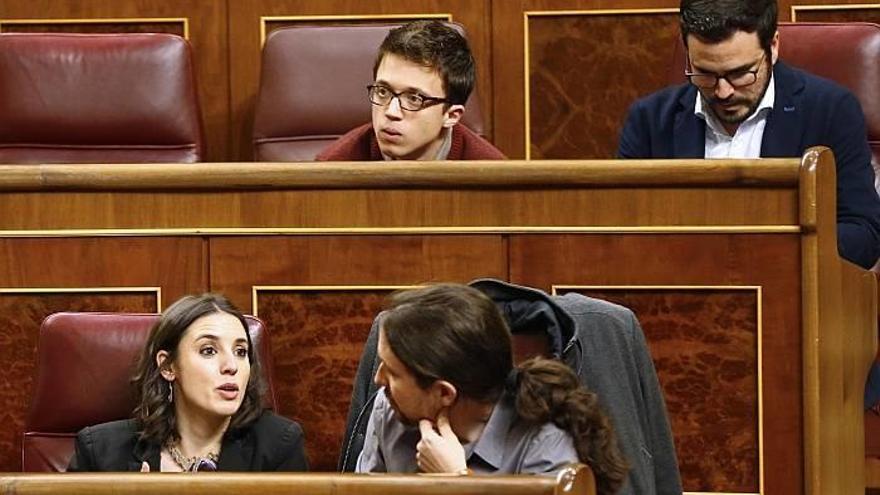 iruñea - El grupo parlamentario de Podemos hizo ayer efectivos los cambios aprobados en la dirección con el debut de Irene Montero como portavoz en el Congreso de los diputados, en sustitución de Iñigo Errejón, y con una nueva reubicación de la posición de sus diputados en el hemiciclo que quita visibilidad a los errejonistas. El ahora secretario de estrategia política, Íñigo Errejón, deja de sentarse al lado de Pablo Iglesias y ocupa desde hoy un escaño en la fila superior; mientras que Montero, como nueva portavoz, es la que se sienta en la butaca contigua a la del secretario general. La nueva portavoz adjunta, Ione Belarra, también baja a esa primera fila de Podemos, detrás de la bancada del Gobierno, para ocupar el escaño siguiente al de Montero.