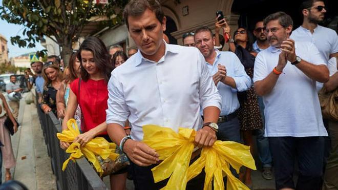 Según Rivera, “hemos querido apoyar a simpatizantes y afiliados, gente que en Catalunya hace lo que debería estar haciendo el Estado porque estamos en una situación de excepción en que el Gobierno español no hace su trabajo” y el Govern únicamente apoya a los “comandos separatistas”. El líder de Ciudadanos recordó la sentencia del Supremo que prohíbe colocar en la vía pública emblemas o enseñas partidistas y advirtió de que no habrá convivencia “hasta que haya neutralidad en el espacio público”. “La realidad está aquí”, dijo, “en la ruptura de la convivencia” que a su juicio provocan Carles Puigdemont, Artur Mas y Quim Torra. A primera hora ambos dirigentes habían concedido sendas entrevistas radiofónicas donde ahondaron en la necesidad de preservar el espacio público de símbolos partidistas y se pronunciaron con dureza sobre la agresión de este fin de semana junto al Parca de la Ciutadella en la que una mujer rusa fue increpada por retirar estos lazos, aunque los Mossos negaron que existiera motivación política en el ataque.