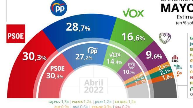 Por su parte, ERC sube una décima desde abril, hasta el 2,5%, seguido de Más País-Compromís, con el 2,1 por ciento, el mismo resultado que en el anterior sondeo.