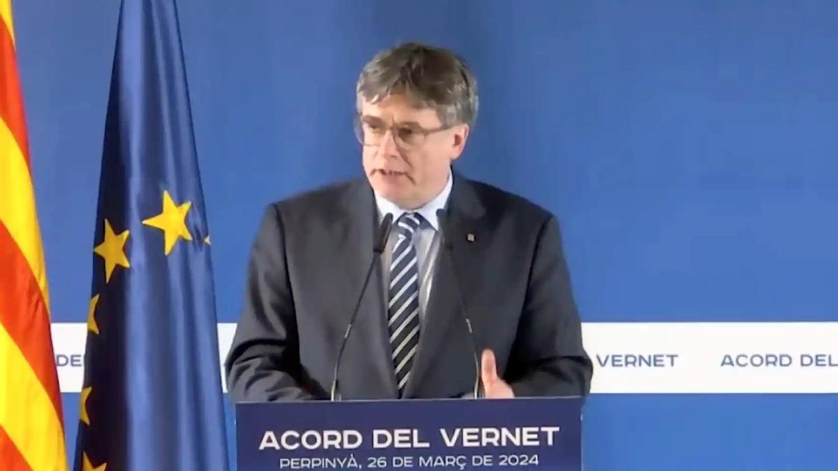 Con el mismo fondo azul que en el acto de Elna de la pasada semana, en el que no se pueden apreciar las siglas de Junts, los partidos que suscriben este acuerdo, con caras reconocibles como la de Antoni Castellà, se comprometieron a acompañar a Puigdemont “en el camino hacia su restitución en plenitud” y a luchar contra la “resignación” que ofrece el Estado español a los catalanes. “Las opciones de victoria pasan por entender que Junts es solo una herramienta y no una finalidad. Venimos a culminar el trabajo que hicimos hace seis años y medio”, recalcó Puigdemont enarbolando el 1-O.