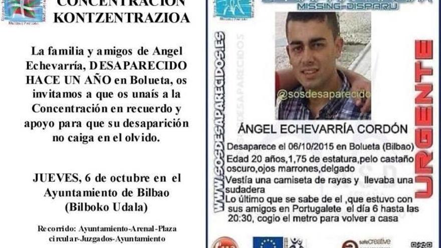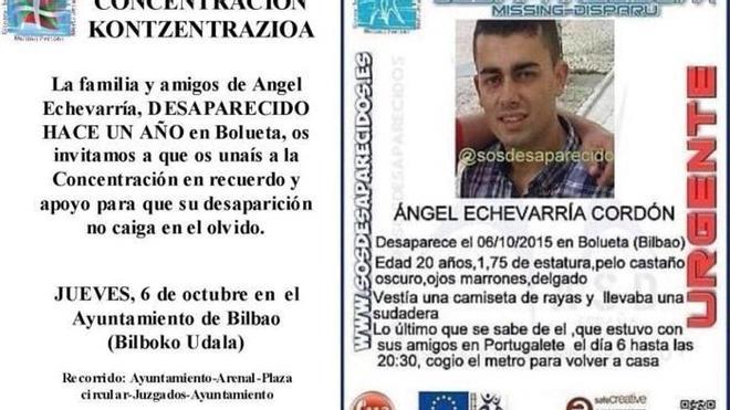 Bilbao - El bilbaino Ángel Echevarría desapareció hoy hace un año. Su pista se pierde en el barrio de Bolueta la noche del 6 de octubre de 2015. Desde entonces, su familia no ha parado de buscarle aunque nada se ha sabido de su paradero. Sin embargo, sus allegados siguen esperándole y con el objetivo de mantener vivo su recuerdo han organizado para hoy, coincidiendo con el aniversario de su desaparición, una manifestación en la capital vizcaina. La concentración se desarrollará a partir de las 11.00 horas y partirá del Ayuntamiento de Bilbao. Posteriormente, la marcha recorrerá El Arenal, la plaza Circular, los juzgados para regresar hasta las inmediaciones del Consistorio bilbaino.