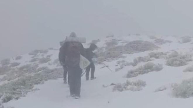 A las 6.15 horas, el equipo inició la aproximación a pie hacia la zona donde se encontraban los montañeros, momento en el que la temperatura era de 1 grado centígrado, con fuertes rachas de viento, ventisca y nieve, generando una sensación térmica de varios grados bajo cero.