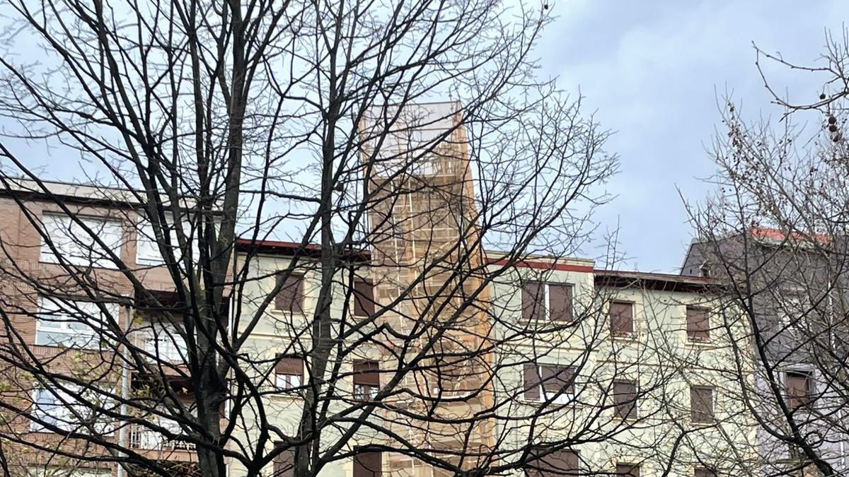 El incidente se produjo alrededor del mediodía de este pasado miércoles en la calle Landaburu de Barakaldo. El fuerte viento impactó contra el andamio, que se desplazó y, aunque estaba amarrado en la fachada, ha quedado torcido sobre uno de sus costados.